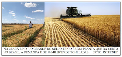 “… uma parceria entre a iniciativa privada e a Empresa Brasileira de Pesquisa Agropecuária (Embrapa) resultou na primeira colheita de trigo no Ceará. O plantio, ainda em fase experimental, produziu a colheita de aproximadamente 9 toneladas de trigo, o que representa uma produtividade de 1,6 toneladas por hectare na primeira colheita…”