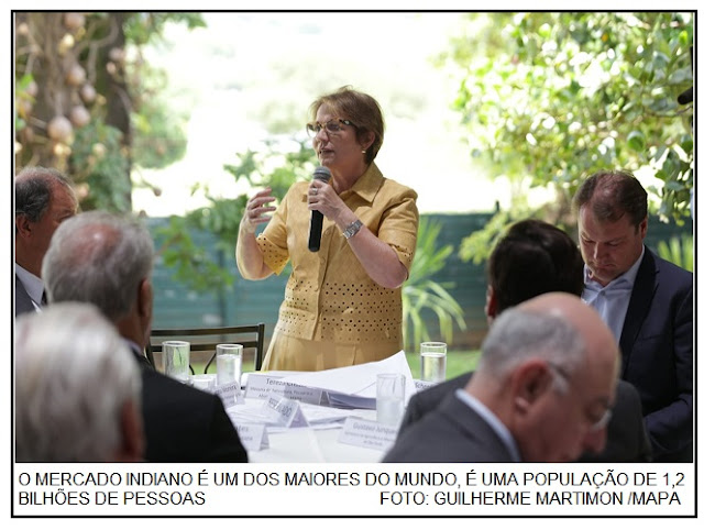 “… a ministra Tereza Cristina (Agricultura, Pecuária e Abastecimento) reuniu-se na terça-feira, dia (17) com a Frente Parlamentar da Agropecuária para fazer um balanço das ações do Ministério em 2019. No encontro, a ministra anunciou uma das primeiras agendas de 2020, quando irá à Índia em janeiro, acompanhando a missão oficial do presidente Jair Bolsonaro, para tratar da ampliação do mercado com o país. Parcerias na produção de etanol serão um dos temas, segundo a ministra. “Um dos pedidos do primeiro-ministro Narendra Modi quando esteve aqui na reunião de Cúpula do Brics foi tratar de bioenergia”, disse a ministra…”
